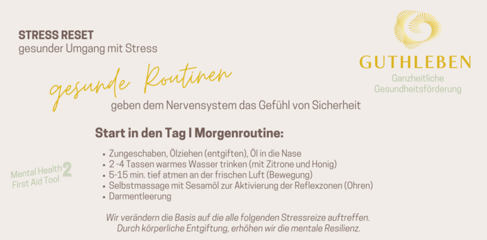 Bei unserer letzten BGFZ.live-Veranstaltung stand alles im Zeichen von innerer Balance, bewusster Selbstwahrnehmung und gesunder Selbstfürsorge. Unter dem Titel „STRESS RESET – Gesunder Umgang mit Stress & Mental Health First Aid“ durften wir gemeinsam mit Johanna Guth, Holistic Health Coach und Gründerin von Guthleben, in die Tiefen des gesunden Stresses eintauchen – praxisnah, inspirierend und augenöffnend.